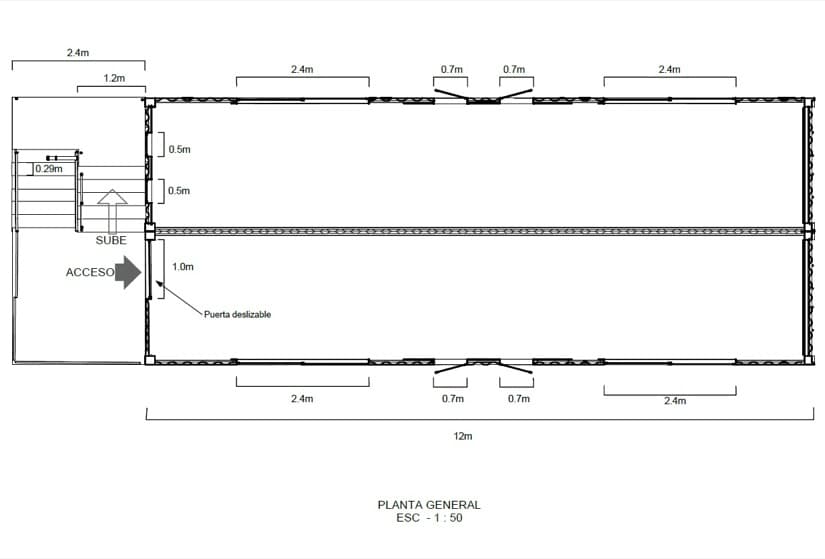Los contenedores fueron debidamente equipados en su interior con material aislante. El acabado final (interior y exterior) está formado por paneles de fibrocemento (hounter douglas super board 8mm); las ventanas tienen carpintería de aluminio y los pisos son de madera laminada. Las instalaciones de electricidad, redes, y vídeo beam, quedaron ocultas en los revestimientos. Toda la construcción se apoya en 6 zapatas de hormigón de 0.8 x 0.8m.