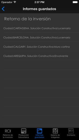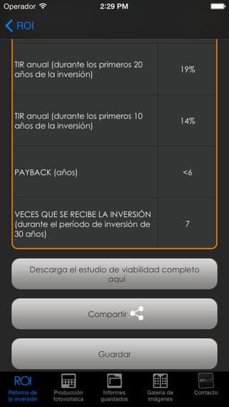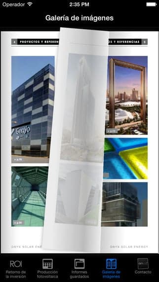 Otra ventaja de la aplicación fotovoltaica de Onyx Solar es que podremos archivar los datos. De esa manera se podrán comparar con diferentes configuraciones y ubicaciones. Además, ofrece ejemplos de proyectos ya realizados, y por supuesto, facilita el contacto con la compañía Onyx (vía web, email, redes sociales…).