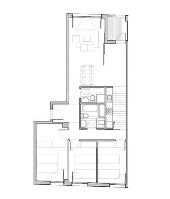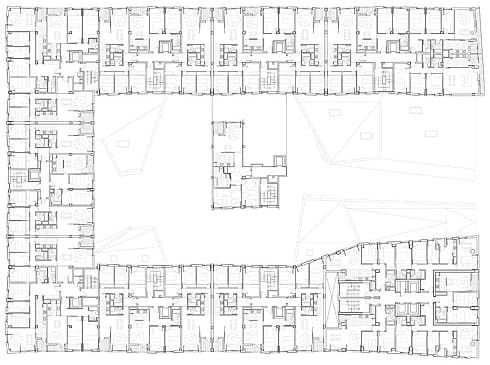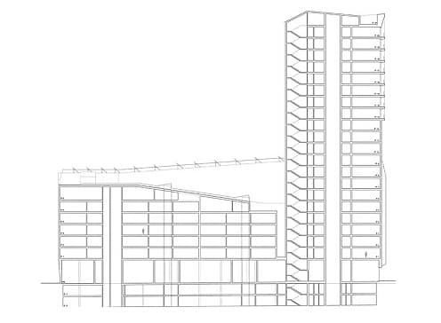 Formalmente en el proyecto destaca una torre de 20 plantas, situada en su extremo sur-oeste. Incluye un bloque continuo que traza una U, de 4 a 7 pisos de altura, cerrando el resto de la parcela. Este volumen crea un patio interior que funciona como una continuidad del espacio urbano.