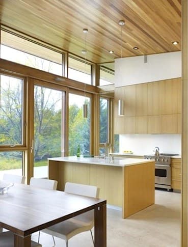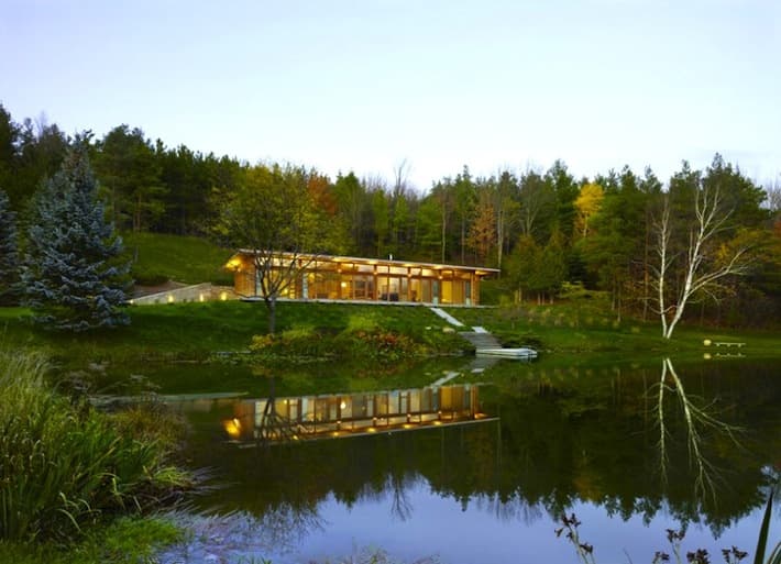 +House es una moderna cabaña construida en una ladera, frente a un lago de Mulmur (Ontario, Canadá). Se encuentra en un lugar idílico, rodeada de árboles, de tal manera que viéndola desde la parte alta de la colina, su cubierta ajardinada se confunde con el paisaje.