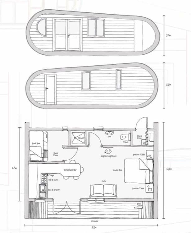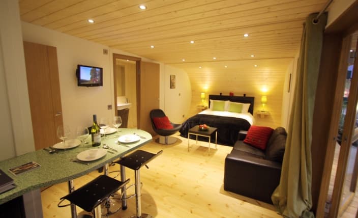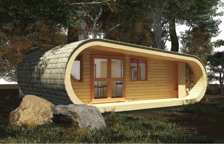 Esta construcción prefabricada se puede colocar tanto en una plataforma entre árboles, como en el suelo. Se diseñó de acuerdo con la normativa británica sobre caravanas y casas móviles. La fabricación en taller de esta cabaña requiere de 6-8 semanas, y su transporte se hace por carretera (en varios módulos). Tan solo necesita 5 días para ser montada en el sitio. Dentro cuenta con una amplia sala con cama grande, sala de estar, y cocina con barra para desayunar. Dentro vemos también un pequeño dormitorio con camas literas; un cuarto de baño con ducha; y un pequeño espacio de almacenaje accesible desde la fachada trasera.