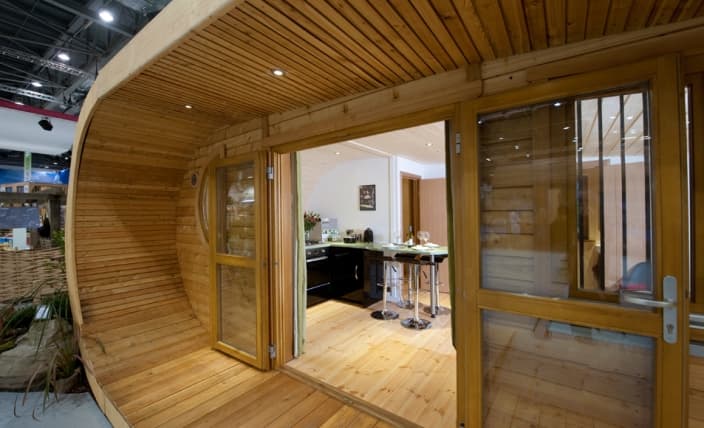 La estructura prefabricada de este post está diseñada para tener una mejor integración en un entorno natural. Su acabado exterior está realizado completamente en madera, y con laterales curvos que la hacen inconfundible. Es EcoPerch, una cabaña de 36.5m2 (superficie útil) con capacidad para cuatro personas.
