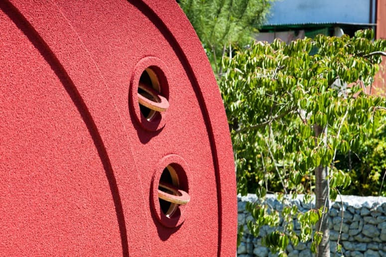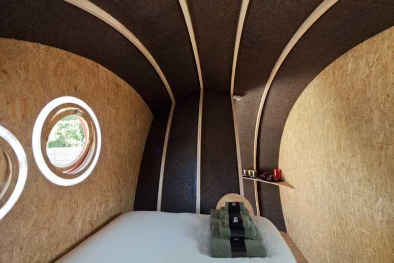 El prototipo de las fotografías está fabricado con corcho, materiales reciclados, y no contaminantes. Se ejecutó siguiendo los principios de eficiencia energética, incorporando delgadas láminas solares integradas en su cubierta, para abastecerse de electricidad. Esta habitación destaca sobre todo por su cómodo transporte, y por colocarse con facilidad en cualquier sitio. Puede funcionar muy bien en el jardín de una vivienda, o para negocios de alojamiento rural.