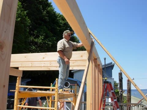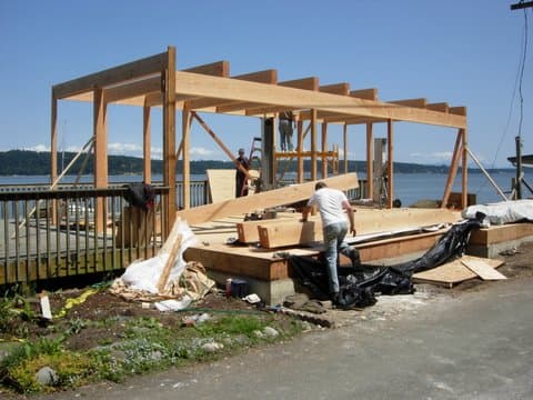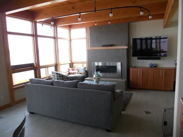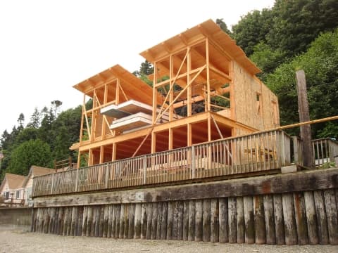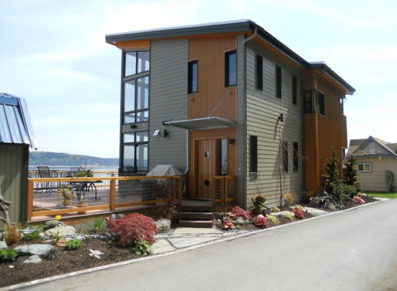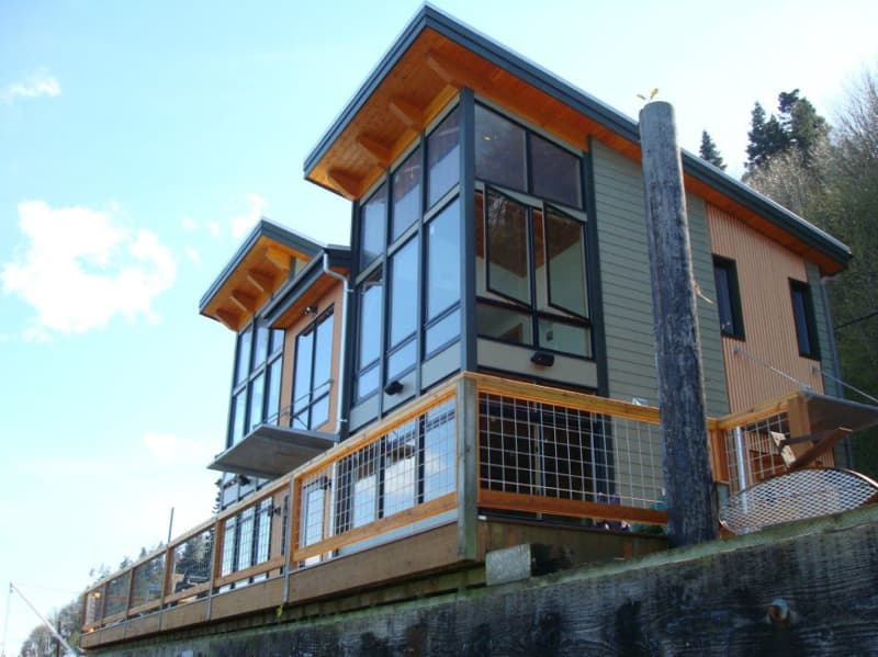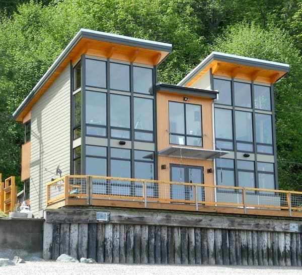Estas imágenes corresponden a una vivienda construida en Camano Island (Washington, EE.UU.). Se trata de un modelo de casa prefabrica en kit de FabCab, una firma de Seattle. Está realizada con madera de bosques sostenibles, materiales ecológicos, y paneles SIPs. Además, posee una gran fachada acristalada para aprovechar la panorámica del lugar.