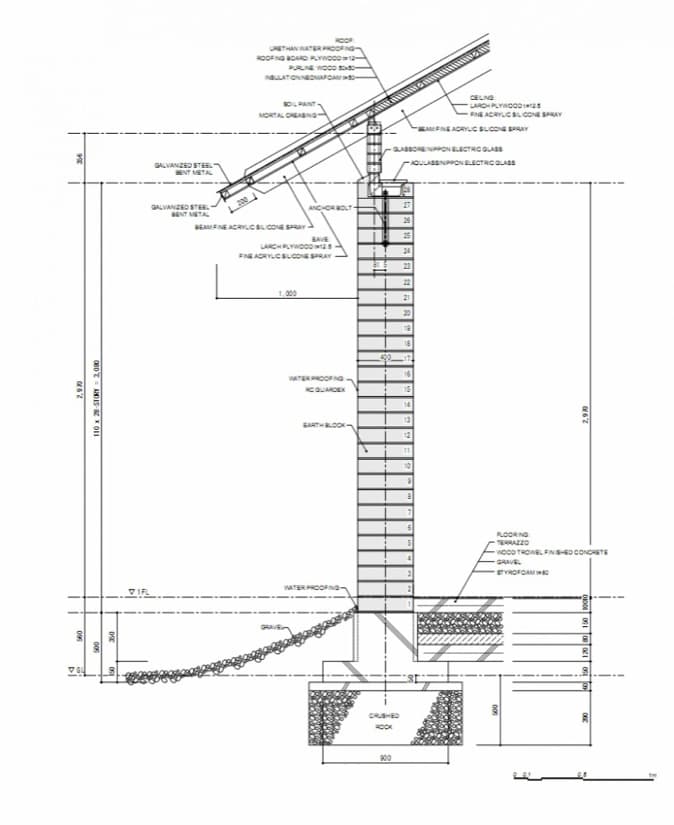 Bajo estas intenciones, se entiende mejor el nombre dado a la vivienda (Earth Brick Residence). Su estructura principal está formada con muros de carga de ladrillo de tierra comprimida y estabilizada con óxido de magnesio. Estos bloques forman muros mucho más resistentes que los de tapial (o tapia), superando incluso uno de los estándares más exigentes del mundo, ya que la casa se construyó en Chiba (Japón).