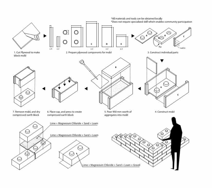 Los aditivos empleados para su fabricación también provienen del suelo. Estamos por tanto ante un ladrillo 100% natural que puede producirse en cualquier parte del planeta. Destaca sobre todo por su gran potencial como material de construcción en países en vías de desarrollo. Este ladrillo ecológico aporta en esos lugares una mayor protección sísmica, frente a sistemas tradicionales.
