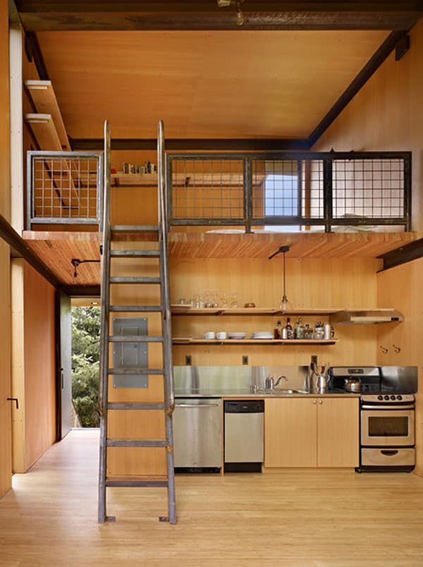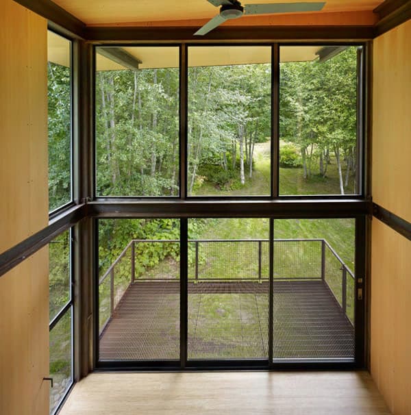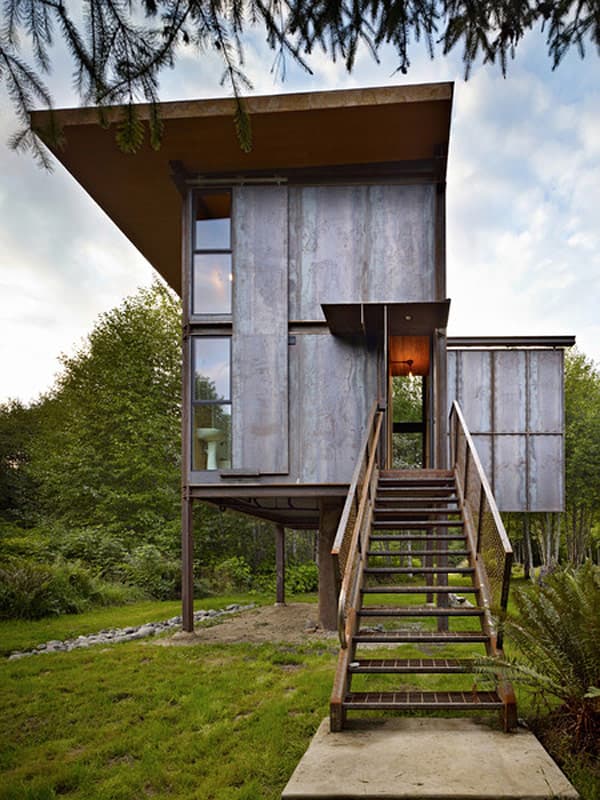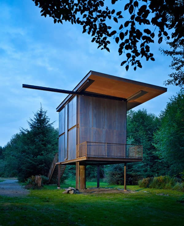 Esta moderna cabaña se construyó para un cliente que le gustaba pescar en la Península Olímpica (Washington, EE.UU.). Tiene una superficie de 32.5m2 y está soportada por cuatro apoyos de acero. Eso la mantiene separada del suelo, con el fin de evitar las inundaciones ocasionales del río cercano. Aquellos usuarios que sigan la sección de refugios, seguramente habrán adivinado que se trata de otro trabajo del arquitecto Tom Kundig. Lo delata el detalle que permite dejarlo completamente cerrado cuando el propietario está ausente. Se utiliza para ello paneles metálicos deslizantes que protegen los huecos, según se aprecia en la siguiente imagen.