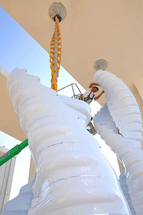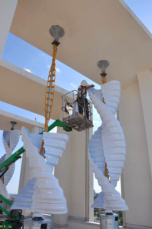 Se trata de un auténtico parque eólico urbano, y un ejemplo de integración de energías renovables y arquitectura. Un detalle interesante es que esta instalación genera electricidad justo donde se va a utilizar. El modelo de turbina elegido es el V2 de Venger (Windonics), basado en los trabajos del ingeniero Sigurd J. Savonius. Mide 5,7 metros de altura, y tiene un diámetro de 1,28m. Esta turbina urbana funciona con vientos a partir de 14.3km/h (por debajo de la velocidad media anual de Oklahoma), y con una potencia de 4.5kW.