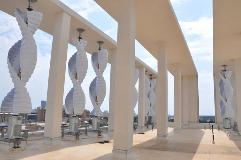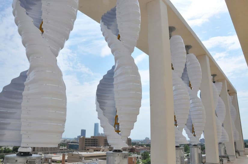 En la ciudad de Oklahoma (EE.UU.) hay una atracción que ver en la torre de la OMRF (Oklahoma Medical Research Foundation). Justo en su azotea se colocaron 18 maravillosas turbinas de eje vertical. Ese conjunto representa la más grande instalación eólica integrada en un edificio que jamás se haya visto.