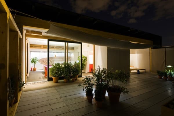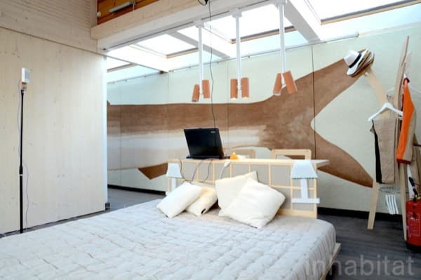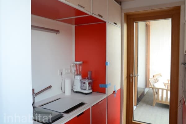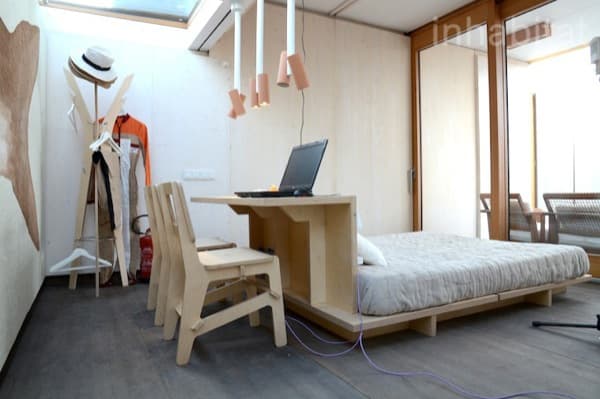 La casa parte de un concepto tradicional, con el dormitorio separado de la sala de estar. Lo mismo ocurre con la cocina, que es un espacio independiente. Pero la fluidez del espacio se garantiza con un corredor que las une, y que puede interrumpirse por unas puertas correderas en cada extremo. El dormitorio está organizado para servir también como lugar de trabajo, ya que el cabecero de la cama es a su vez un escritorio.