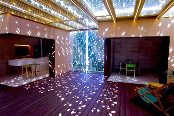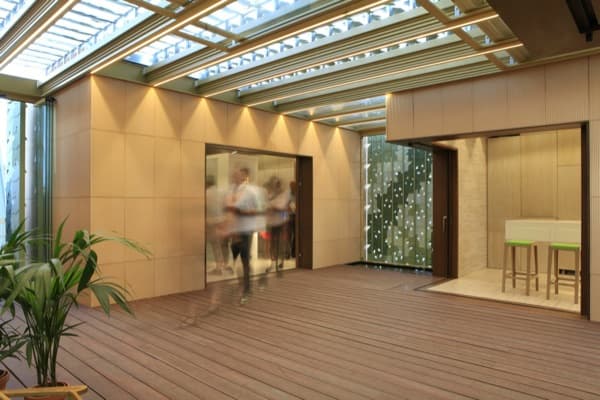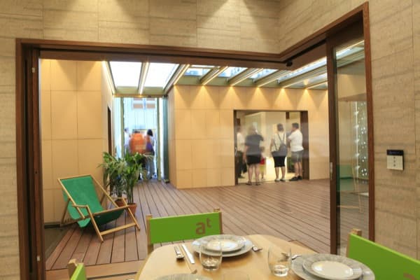 El patio de la vivienda sirve como ‘espacio flexible’ para algunas de sus funciones. Pero también es el encargado de controlar las condiciones de confort para sus ocupantes. Define una estancia mediterránea cuya luz natural está modulada. También controla la humedad, temperatura, olores, y sonidos. Es una pieza formada por un revestimiento de vidrio y una piel exterior que simula hojas de parra (pintadas en diferentes tonalidades de verde). Esas hojas se pueden girar para dar mayor o menor sombra al patio. En otras palabras, para controlar las ganancias térmicas (todo ello controlado domóticamente). Patio 2.12 también funciona con diferentes chimeneas solares que utilizan la convección generada por el aire caliente.