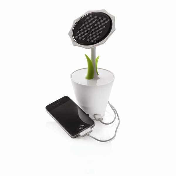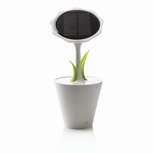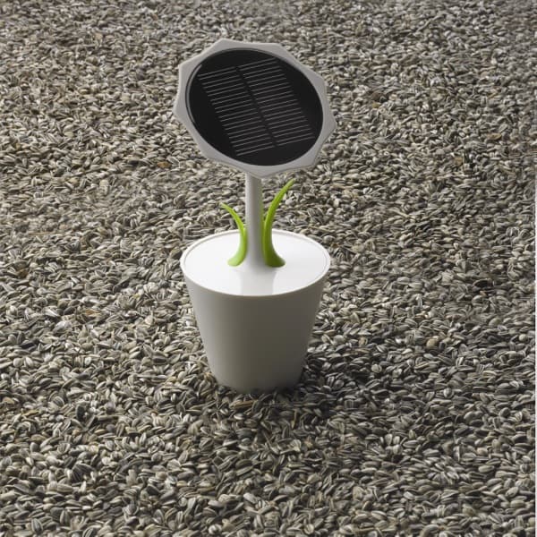 Solar Sunflower es una bonita manera de traer la recarga por energía solar a nuestro escritorio. Su diseño simula a un girasol en una maceta, combinando tan solo el color blanco con el verde de sus dos hojitas. En él se ha insertado un oscuro panel fotovoltaico circular (5V/100mA). En su interior hay una batería recargable de litio (2500mAh) que es lo suficientemente potente para cargar un teléfono móvil.