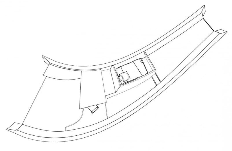 En sus 25m2 de superficie se ha distribuido una zona de trabajo, cocina, y dormitorio (en un habitáculo claustrofóbico). También se diseñó gran parte del mobiliario. Es un refugio hecho principalmente con madera de fresno, abeto, y álamo, pero con la parte frontal de acceso completamente vidriada. Está construido de forma respetuosa con el medio ambiente, y sin cimentación alguna que altere el terreno.
