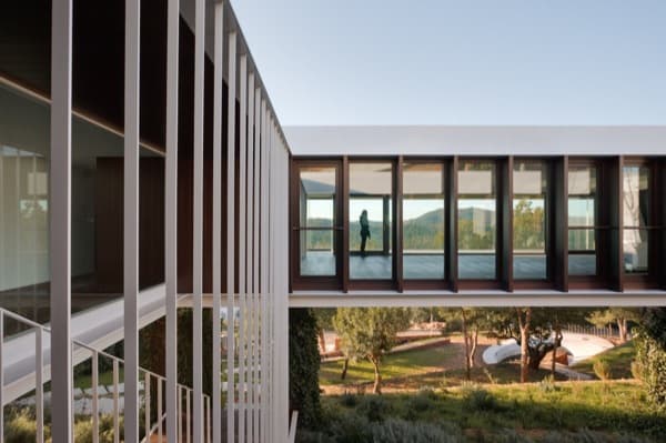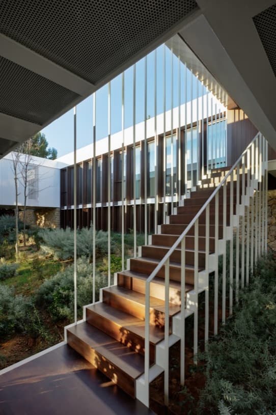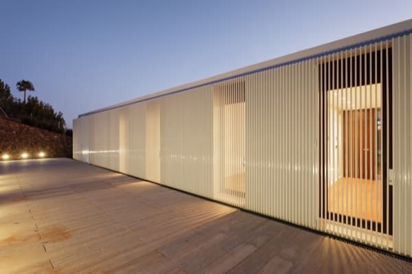 El aspecto de esta construcción se aleja de las viviendas prefabricadas que solemos ver aquí. La mayor parte de esta casa se fabricó en taller. Se debió a una importante decisión tomada durante su proceso de diseño. Es la Casa BF, está en una parcela de 3.000m2 de Castellón (España). De ella hay que destacar dos aspectos importantes: un desnivel de 25 metros, y un perfil escalonado del terreno mediante bancales. Estas bancadas fueron realizadas siglos atrás con muros de piedra, para el cultivo. Pero debido al abandono, crecieron diferentes especies arbóreas.