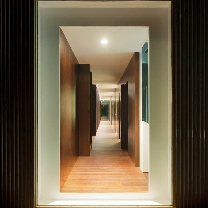 BF House tiene un patio rectangular, pero tan solo conecta fachadas opuestas visualmente, pues está en otro nivel. Eso le da a la vivienda otra dimensión desde el lado inferior, y sirve para refrescar las estancias en verano. En la fachada principal encontraremos el salón-comedor, cocina, y dormitorio principal. El resto de habitaciones están dispuestas en el lado opuesto, conectadas a un largo corredor. Hay que señalar que la terraza del salón está dimensionada para permitir el soleamiento en invierno, y evitarlo en verano.