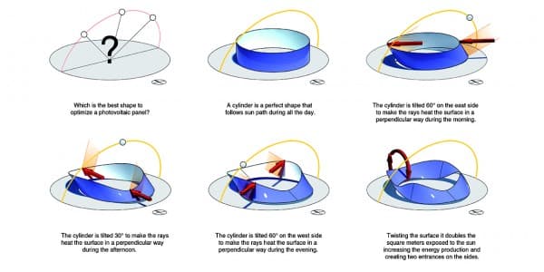La estructura es una superficie alabeada que tiene una cara siempre expuesta a la radiación solar. Esta superficie está revestida con células fotovoltaicas, mientras que la otra es una superficie reflectante (un gran espejo). La forma de este pabellón se ha conseguido de los diagramas solares, ofreciendo por su geometría un gran aprovechamiento energético.