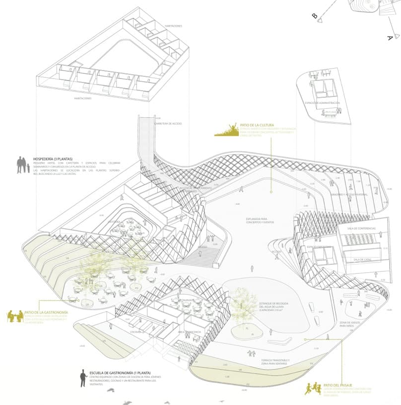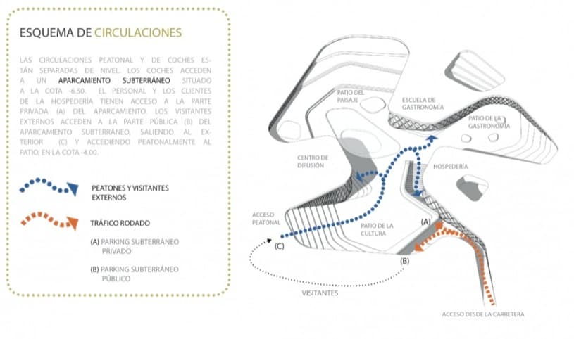 Estas instalaciones están planteadas como un espacio cultural y de experiencia gastronómica. Está enfocado a jóvenes restauradores que quieran aprender en su escuela de gastronomía. El programa incluye además un pequeño hotel de tres plantas, donde las habitaciones están ubicadas en los pisos superiores (mejores vistas). Dispone además de cafetería y salones para seminarios y congresos en el nivel de acceso. El tercer elemento se corresponde con un área de difusión (de dos plantas). Ahí hay espacios expositivos para explicar y divulgar todo lo relacionado con el vino. En su nivel superior están las oficinas administrativas del complejo.