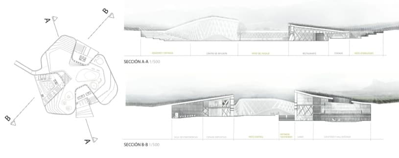 Todo el programa está diseñado manteniendo un gran respeto por el paisaje, de tal manera que la forma se obtiene por el maridaje entre la topografía del terreno y los requerimientos del edificio. Probablemente la frase que mejor describe esta intención sea la que encontramos en la memoria del proyecto: