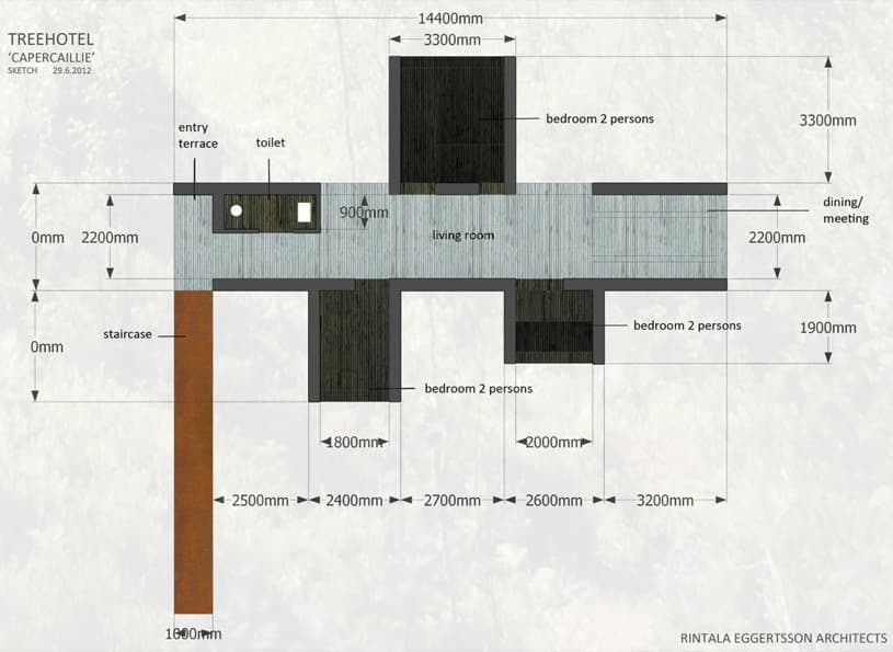 Esta casa de campo tan especial está montada a seis metros por encima del suelo, entre pinos de más de cien años de antigüedad. Por supuesto dispone de unas excelentes panorámicas a su entorno. Como se puede apreciar en los renders, el exterior es de acero corten, y el interior va revestido de madera. Revisando las dimensiones del plano de planta, llama la atención que la sala de reuniones tenga una anchura de tan solo 220cm. Es el espacio justo para una mesa con bancos a ambos lados. Una cosa está clara, los de Treehotel siguen empeñados en ser únicos en el mundo en este tipo de alojamientos.