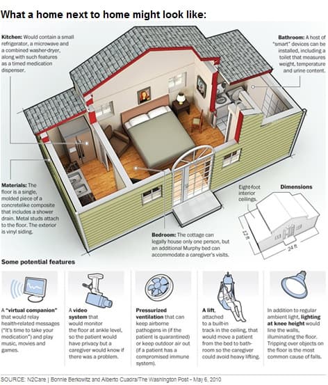 MEDCottage es un interesante modelo de casa prefabricada, de tamaño reducido. Se puede colocar casi en cualquier parte, como una casa móvil. Se diseñó para proporcionar atenciones médicas a personas mayores y/o discapacitadas. Es una alternativa para que hijos adultos con padres en edad avanzada puedan crear un espacio en su propiedad. De esa manera pueden estar más cerca de ellos, evitando el traslado a residencias. En definitiva, es como tener una habitación de hospital al lado de casa, con muchas comodidades y lujo. Además posee un sistema de monitoreo remoto para el personal sanitario.