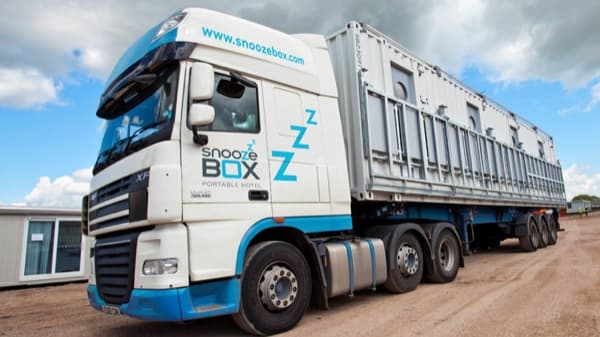 Snoozebox es una compañía que ofrece un servicio de alojamiento temporal en cualquier parte. Lo hace empleando módulos de contenedores de carga, transportándolos por carretera, para montar en poco tiempo (48 horas) auténticos hoteles. Estos edificios de contenedores se configuran según las necesidades, incluso de forma apilada.