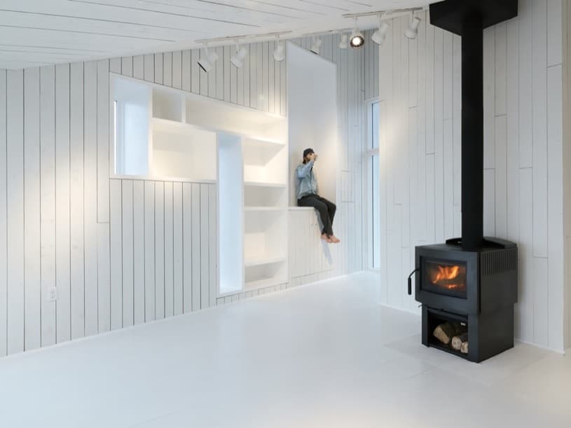 En su interior, la mayor parte del espacio (30m2) es área de trabajo. Pero el estudio también cuenta con un aseo (con compost), una pequeña cocina, y chimenea de leña. El aspecto que más sorprende es la inclinación del techo y posición de los muros laterales. Sirven para localizar la atención hacia el hueco situado al fondo, el que mira al mar. Todo el refugio está revestido con tablones verticales blancos de madera.