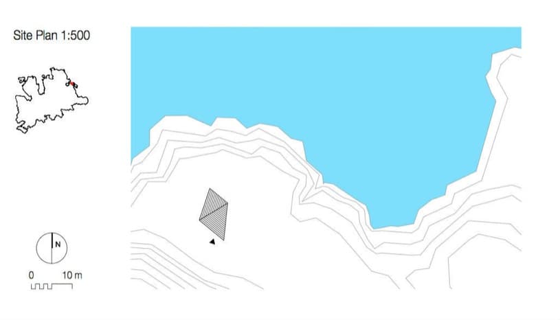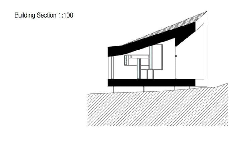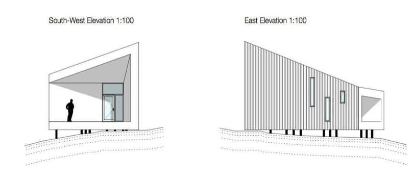 Mirándolo desde cualquier punto de vista, Squish Studio es puro vértice. Su planta tiene forma trapezoidal, con terraza a la entrada y otra en el extremo opuesto (con vistas al mar). Ambas terrazas siguen la geometría de un triángulo. La cubierta de esta pequeña estructura tiene una importante inclinación. Eso hace que todo el conjunto adquiera un fuerte contraste, y se proteja mejor de los vientos dominantes.