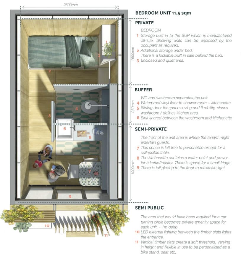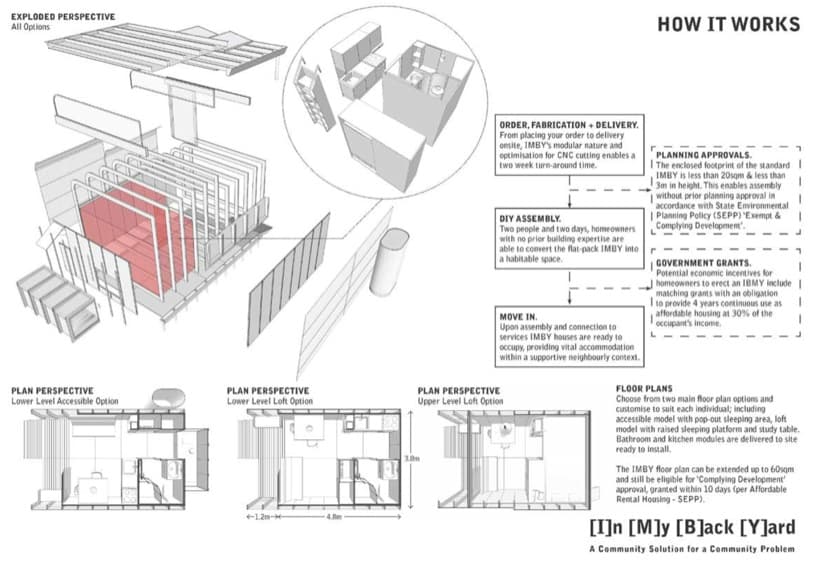 Hubo unanimidad a la hora de decidir que el ganador debía ser el proyecto de Levitt Bernstein. Es una solución que viene a sugerirnos que, existiendo personas sin hogar, es mejor dejar que sean ellas las que ocupen los garajes, y no los vehículos. Este proyecto consiste en una adaptación de cierta tipología de garajes muy populares en el Reino Unido, situados en los bajos de algunos edificios del este de Londres, muchos de ellos infrautilizados. El autor define un sistema prefabricado en kit que consiste en una serie de paneles con un acabado digno. Tiene una buena capa de aislamiento, y van encajados en una estructura de aluminio. Incluye todo el equipamiento para el aseo, pequeña cocina, mobiliario, vallado en la entrada, así como puerta y ventana. Este sistema está presupuestado en 13.065£.