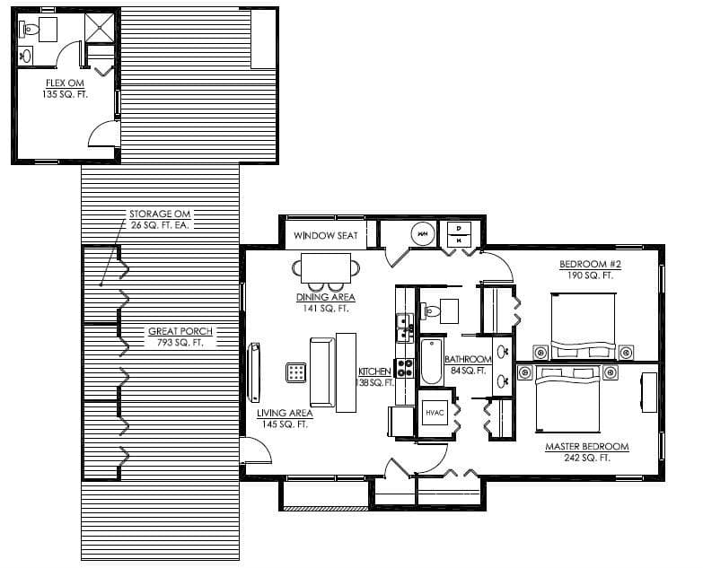 El diseño base tiene una superficie de 96m2, con dos dormitorios y un cuarto de baño. Se le puede añadir un módulo de 13m2 independiente (Flex OM) con baño, que puede funcionar como habitación de huéspedes, oficina, etc… También hay previstas unas pequeñas unidades para almacenamiento (cada una de 2,4m2). Estos elementos están conectados a la vivienda a través de un porche de madera que puede tener (opcional) unos paneles fotovoltaicos translúcidos incorporados (bi-faciales).