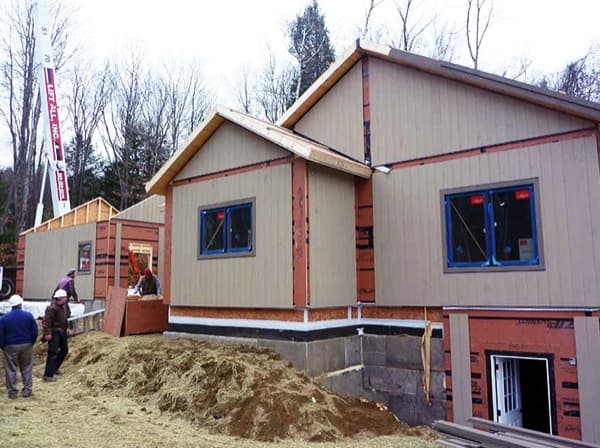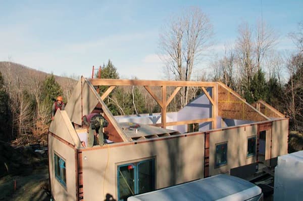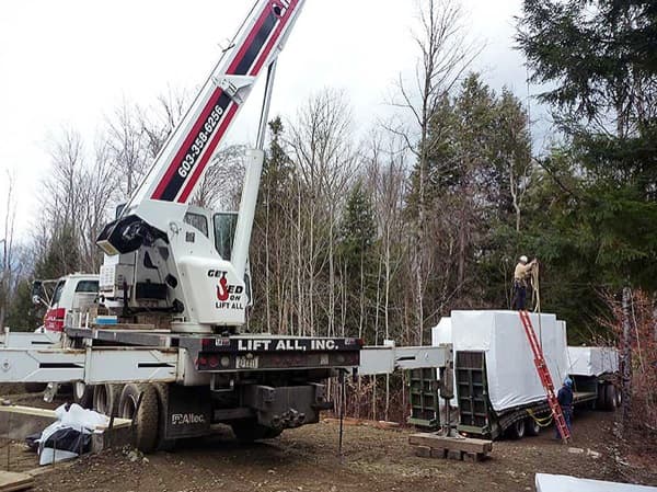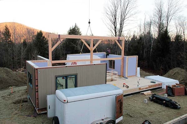 Estas imágenes se tomaron durante el ensamblaje de un modelo Xyla (en Vermont). El proceso duró tan solo tres días, con la ayuda de una pequeña grúa y un grupo reducido de operarios.