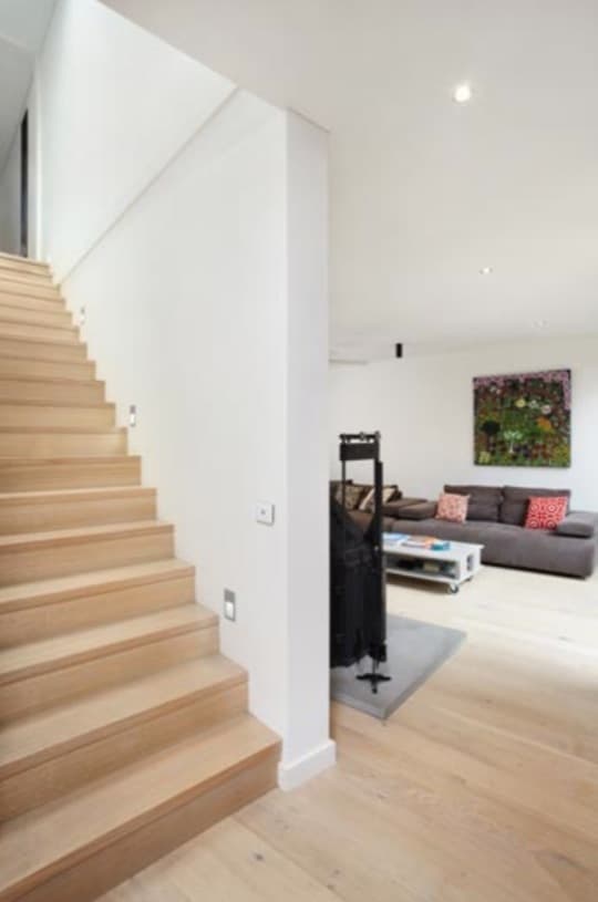 La planta superior de esta vivienda dispone de 5 dormitorios alineados (ver plano), que comparten una configuración poco común de baños y aseo. La intención no es otra que aumentar las posibilidades de uso. Abajo hay una habitación separada (con almacén y aseo) pensada para utilizar como sala de juegos y entretenimiento. El mueble de la cocina (de material Corian) se ha prolongado hacia el porche para formar una mesa al aire libre. El revestimiento exterior está hecho con madera de teca oscurecida y madera shadowclad.