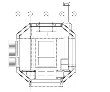 La unidad base tiene cuatro metros de largo. Es fácil de transportar e instalar en el sitio, sobre una sencilla cimentación de hormigón. Tiene una sección octogonal, un acabado exterior de aluminio, y el interior de madera contrachapada de abedul. Su estructura está hecha de perfiles metálicos y paneles de madera laminada (SIP). No posee de instalación de fontanería, ni aseo, pero con un poco más de longitud (ver planos) es posible disponer de una oficina MOSS con inodoro y una pequeña cocina.