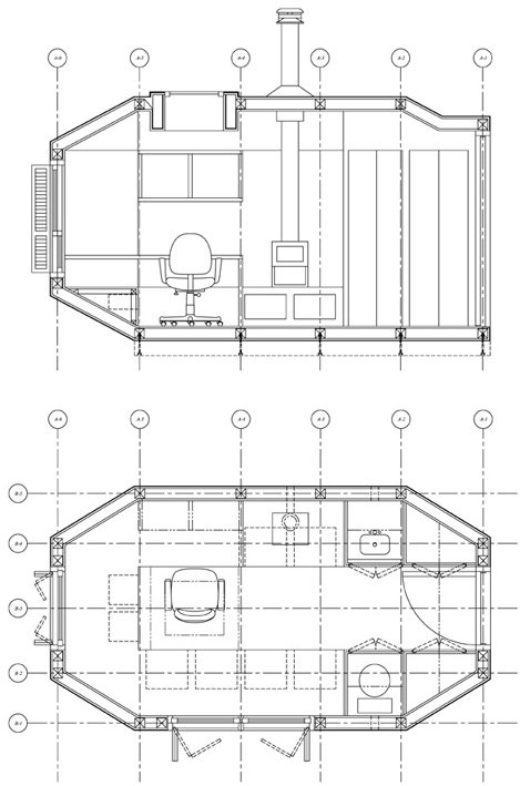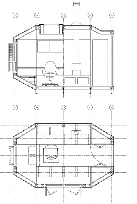 La calefacción de estas casetas de jardín se realiza por una instalación por suelo radiante. También hay una estufa de leña, que se puede utilizar durante los días de más frío. En el aspecto energético, estos búnkers para trabajar pueden funcionar mediante paneles solares situados en cubierta, y un pequeño molino de viento.