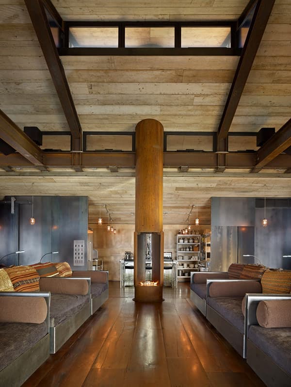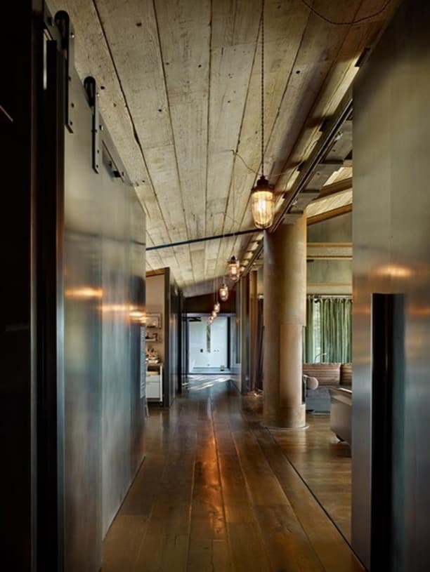 Esta casa de campo se construyó con parte de los materiales recuperados. Vemos madera de roble, paneles de yeso sin pintar, paredes de acero, y revestimientos de acero corrugado. Se emplearon tanto en paredes como en las cubiertas.