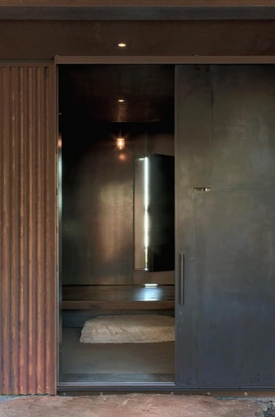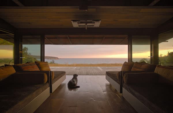 Los dormitorios están organizados según un corredor, paralelo a grandes puertas correderas de acero que delimitan el salón. Este espacio principal está presidido por una chimenea, y cuenta con grandes sofás-cama dispuestos sobre plataformas rodantes. De esta manera el espacio se adapta a diferentes usos. Unos paneles exteriores se pueden utilizar como toldo, pero cuando están cerrados aportan seguridad a la casa en periodos en los que no está ocupada. En uno de los extremos está situado el cuarto de baño. Es un módulo independiente cuya cubierta (488 x 610mm) se puede abrir. Sí, has leído bien, como si fuera una caja de puros, con solo pulsar un botón. En los vídeos añadidos se puede ver su funcionamiento.