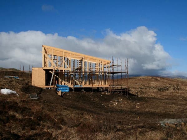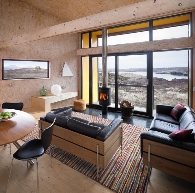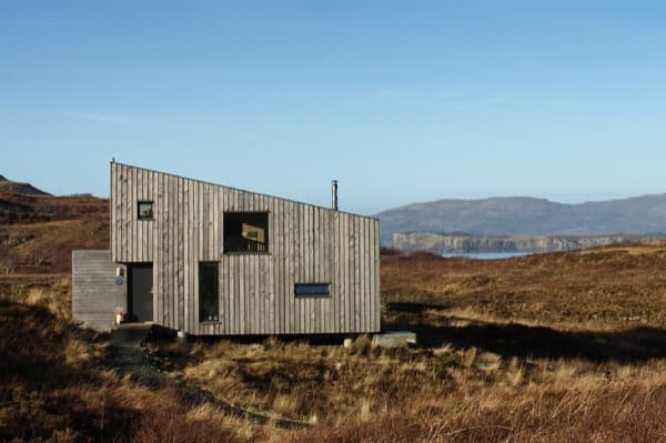 El proyecto Hen House se construyó sobre pilotes, y tiene una pequeña pasarela de madera en la entrada. Su fachada norte está completamente acristalada, hacia el hermoso paisaje de las Tierras Altas de Escocia (isla Skye). Su planteamiento y tipología se aproxima bastante a muchas de las casas de campo escandinavas que hayamos visto antes. Tiene una disposición asimétrica de huecos, y un tejado de única pendiente.