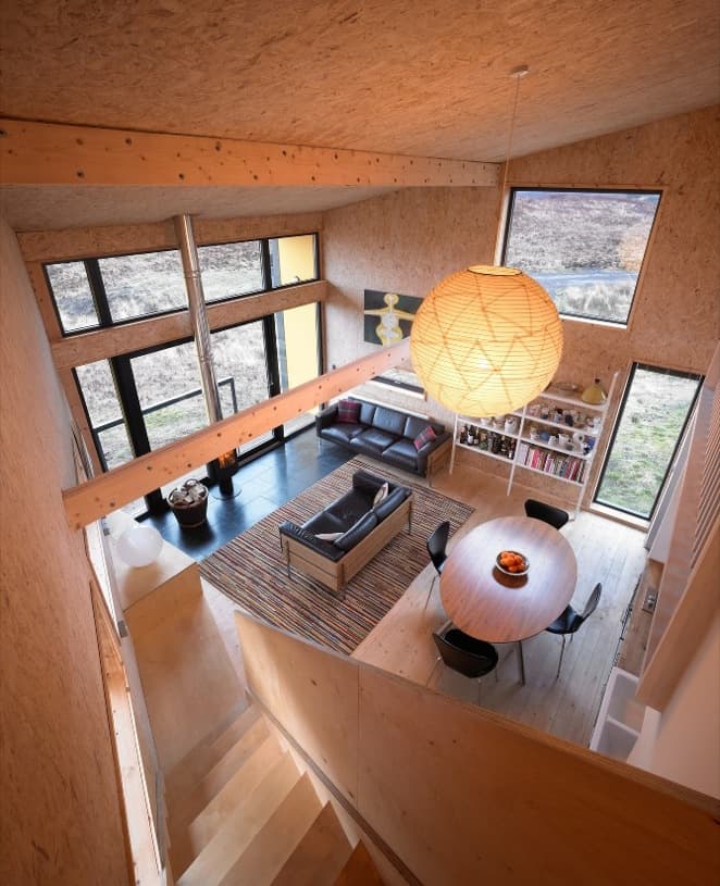 Dentro hay sitio para dos dormitorios, uno en la planta superior y el otro abajo. En la planta baja encontraremos además un espacio diáfano para el salón, comedor, y cocina. La sala llega hasta la altura que permite la cubierta. Para lo pequeña que es, sorprende que tenga un aseo y un cuarto de baño completo. La estructura de esta vivienda es de madera, así como el revestimiento exterior. En el interior se han utilizado paneles OSB, con acabado de virutas de madera.