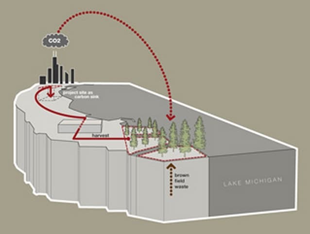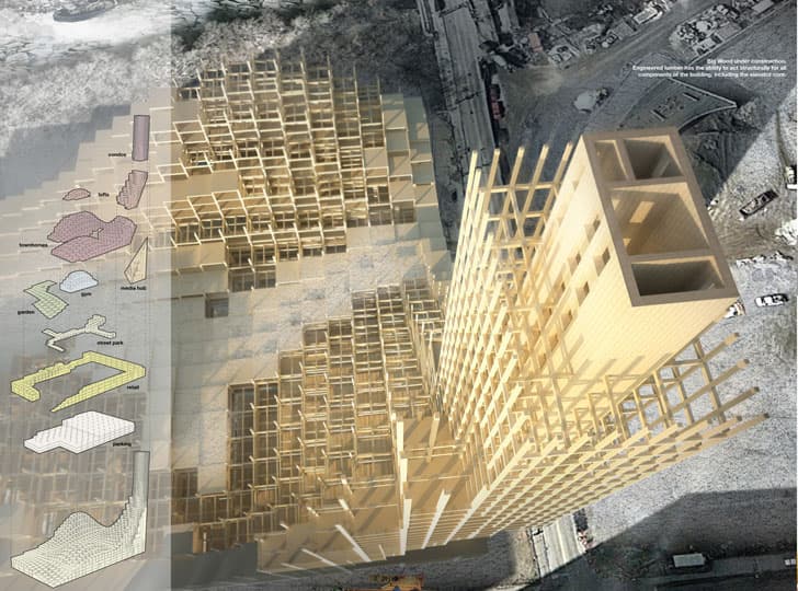 Big Wood se construiría con la madera procedente del sur de Chicago, y tendría un uso mixto. Incluye tres tipos diferentes de viviendas, además de tiendas, biblioteca, un complejo deportivo, aparcamientos, y jardines comunitarios (azoteas ajardinadas).
