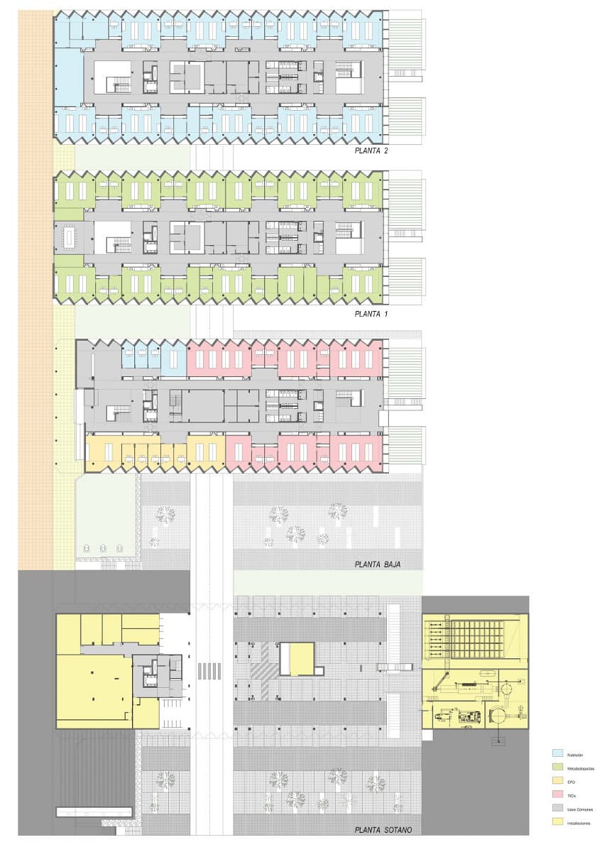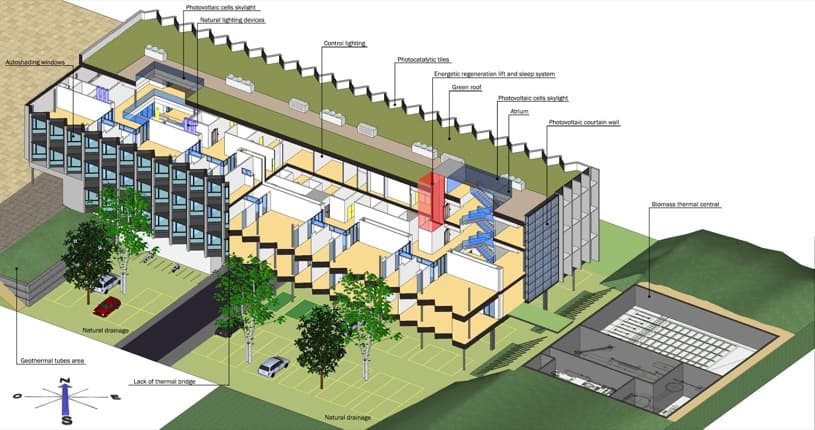 Es importante señalar que también se establecieron estrategias para hacer de él un edificio eficiente. Por eso tiene un diseño bioclimático que proporciona ventilación pasiva; un gran aislamiento en sus cerramientos (hay azotea verde); iluminación de bajo consumo; 46% de superficie acristalada, tubos de luz… Con estas estrategias se consigue un ahorro superior al 60%, si lo comparamos con un edificio convencional de similares características.