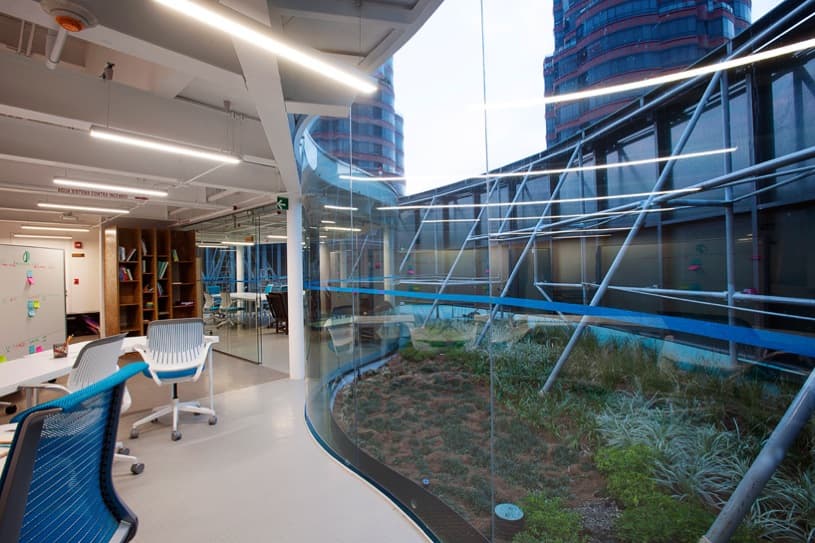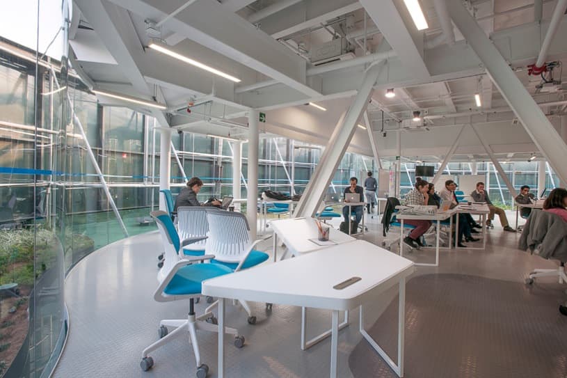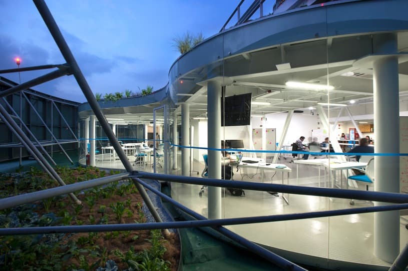 Otro aspecto importante fue el de la iluminación. La construcción tiene fachadas curvas, y están formadas por paneles de vidrio curvados. Eso hace que la iluminación natural sea excelente. La tecnología LED y los paneles fotovoltaicos, completan esta construcción sostenible.