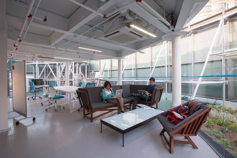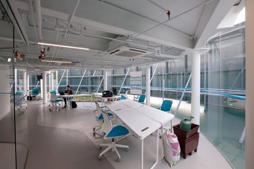 Para su construcción, se reciclaron materiales y se emplearon varias tecnologías limpias. En los espacios al aire libre ahora hay terrazas ajardinadas y un mirador, con plantas que se abastecen del agua de lluvia almacenada. Dentro se ha recurrido a una estética industrial que evita el uso de elementos que oculten instalaciones. Los muebles están hechos a medida, siguiendo una configuración flexible mediante el empleo de módulos fácilmente intercambiables.