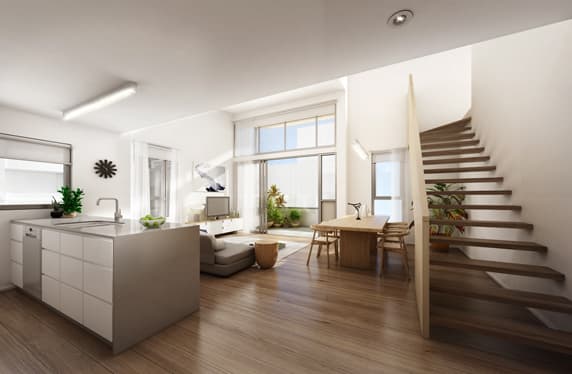 - Suelos de madera de alta calidad, modernos muebles de cocina con armarios de acabado en poliuretano satinado, y gruesas encimeras de piedra artificial.