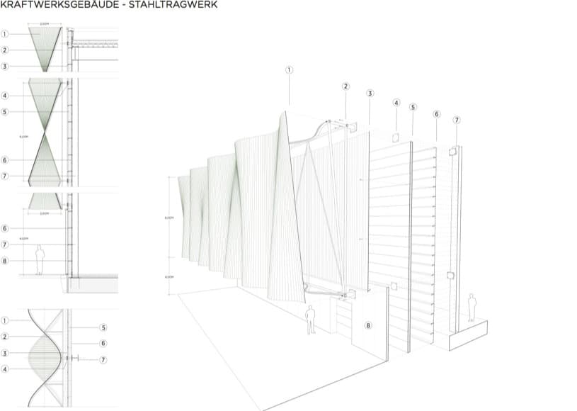 El proyecto de reforma se aprovecha de la estructura existente, y añade una ‘piel exterior’, formada por una superficie ondulada. Esta parte se utiliza de soporte para unos jardines verticales (formados por plantas trepadoras), con lo que se consigue reducir la imagen dura industrial del edificio. La superficie de las enredaderas también sirve para absorber CO2. El soporte de esta piel está formado por una estructura de acero galvanizado, revestida de un material poroso delgado. De esa manera se permite la ventilación y el paso de la luz.