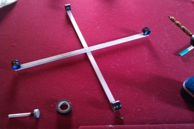 Los elementos de las botellas están pegados con epoxy, aunque para mayor seguridad se han envuelto los tapones con cinta aislante. Los brazos metálicos de este prototipo tienen una longitud de 46cm y una achura de 2,5cm. Se ha utilizado epoxy para fijar los tapones en cada extremo, y también para unir las brazos entre sí en la cruz. Es importante dejar que el epoxy endurezca antes de continuar con el proceso. Bastará enroscar las cabezas de las botellas en los tapones para tener los recolectores listos.