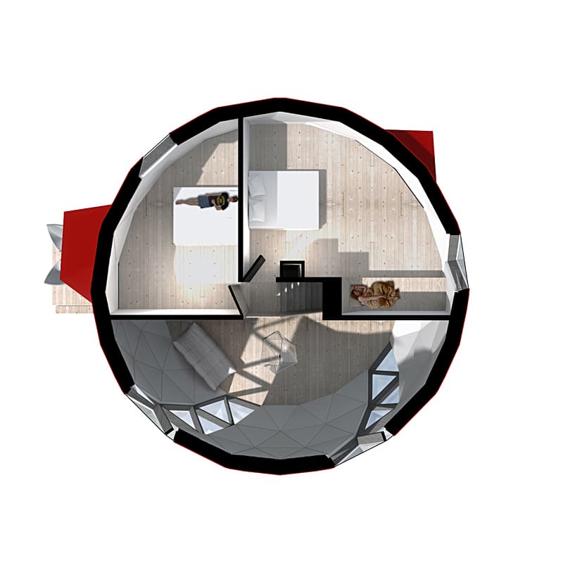 Destaca principalmente por estar encerrada en un volumen esférico, formado por una estructura hecha con madera laminada y perfiles metálicos. Tiene un aislamiento de 20cm, y un acabado exterior de paneles de 9mm de GRC (hormigón con fibra de vidrio) recubiertos con una capa de caucho. El interior está revestido con madera contrachapada de abedul, y lo que parecen ser paneles de yeso.