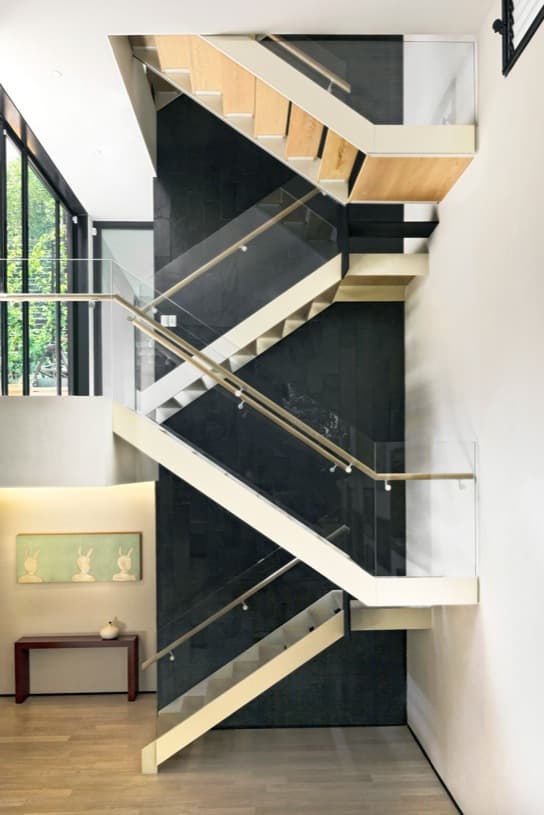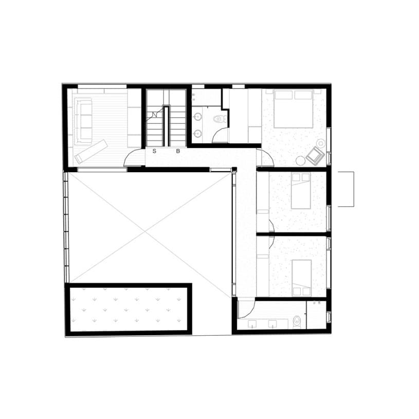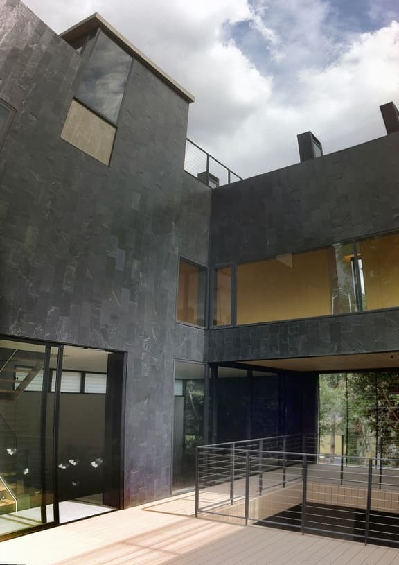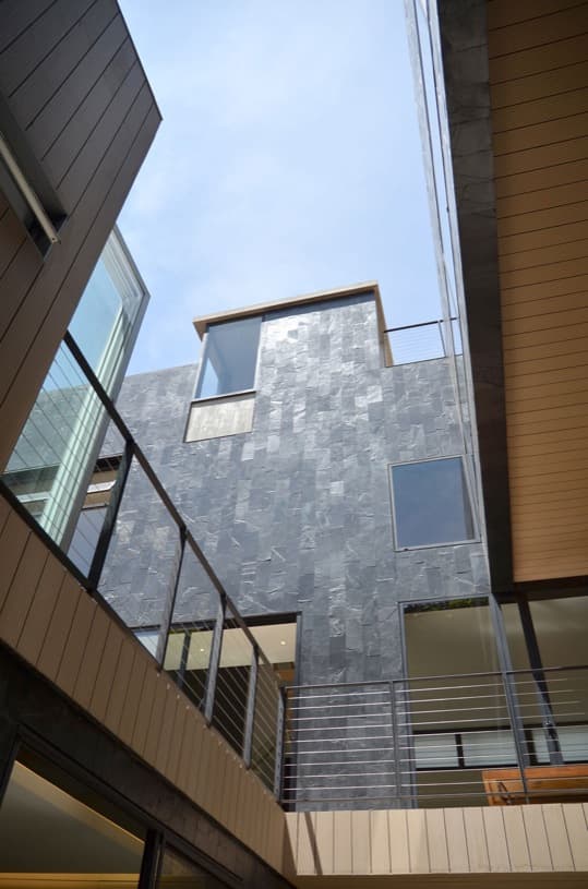 El proyecto presenta además un buen contraste entre la piedra negra de sus fachadas, y la madera de haya. Pero lo más interesante para nosotros fue saber que se construyó empleando materiales reciclables, y pinturas de bajo contenido en COV (compuestos orgánicos volátiles). Además, para su diseño se tuvieron en cuenta estrategias energéticas de control pasivo, con tres chimeneas que son capaces de evacuar el aire caliente del interior.