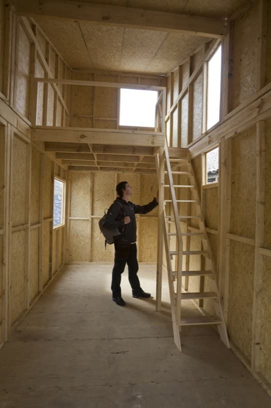 La casa VED ocupa un rectángulo de 2,44 x 8,54 metros. En su interior hay espacio para una sala con una pequeña cocina, un cuarto de baño. Arriba hay un altillo, accesible mediante una escalera de madera. Es lo típico que solemos encontrar en una vivienda diminuta.