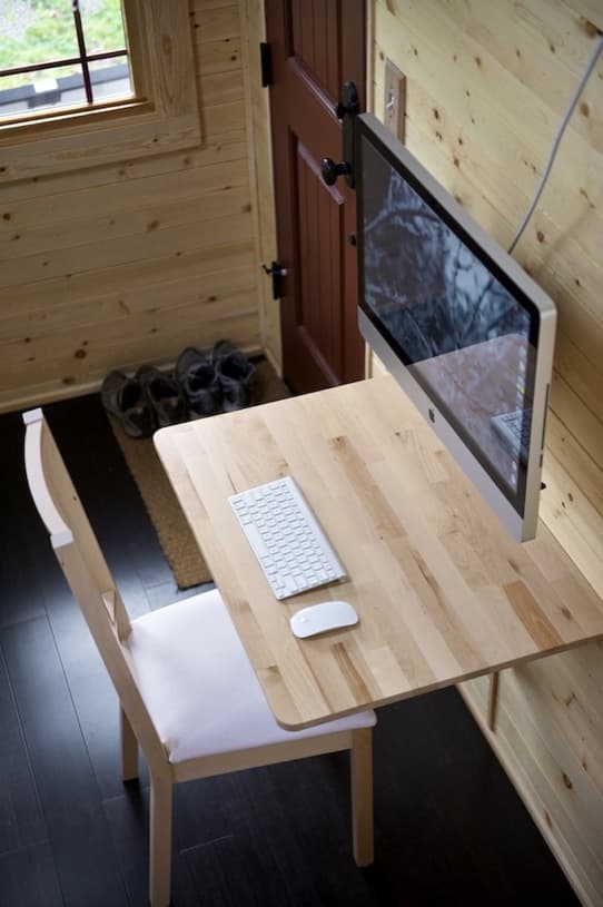 La Casa Tack tiene 13m2, pero cuenta con todo lo necesario para que esta pareja (y sus dos gatos) pueda llevar un estilo de vida sencillo y compacto. A diferencia de otros modelos, esta casa móvil carece de porche. La puerta de entrada está situada junto a una esquina lateral, dando acceso directo al salón. Es un espacio que funciona también como comedor y estudio, simplemente abatiendo un tablero de madera que hay justo debajo de un iMac (montado sobre la pared).