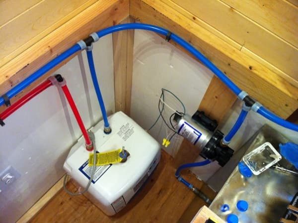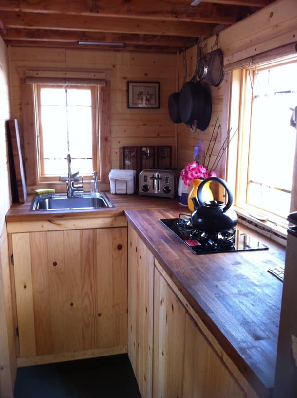 Para dormir, hay que subir por una escalerilla al loft, que resulta mucho más espacioso de lo que viene a ser habitual en este tipo de viviendas. Se beneficia del cambio de pendiente de la cubierta. Justo debajo del dormitorio está la cocina y el cuarto de baño, que tiene inodoro de compostaje y una ducha.