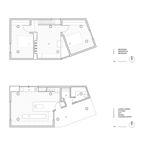Como se puede observar en los planos de planta (abajo), el edificio tiene capacidad para cuatro personas. Hay dos dormitorios situados en el piso superior, además de un amplio estudio. Abajo hay espacio suficiente para una sala de estar con cocina y comedor, aseo, y sauna. Hay un porche en la entrada.